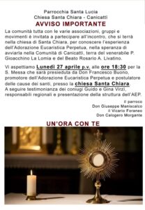 E domani, lunedì 27 aprile, alle 18:30, sempre nella chiesa santa Chiara, don Francesco Buono, promotore dell’Adorazione Eucaristica Perpetua e postulatore delle cause dei santi, incontrerà associazioni e movimenti di Canicattì. L’obiettivo è far conoscere e avviare anche nella città del beato Rosario Angelo Livatino e del venerabile padre Gioacchino La Lomia l’esperienza dell’adorazione eucaristica perpetua. La candidata migliore sarebbe la chiesa santa Lucia, sia come struttura che come posizione strategica.