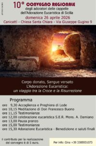 “La comunità tutta con le varie associazioni, gruppi e movimenti – dicono i sacerodti – è invitata a partecipare all’incontro, che si terrà nella chiesa di Santa Chiara, per conoscere l’esperienza dell’Adorazione Eucaristica Perpetua, nella speranza di avviarla nella Comunità di Canicattì, terra del venerabile P. Gioacchino La Lomia e del Beato Rosario Angelo Livatino. Vi aspettiamo Lunedì 27 aprile alle 18:30 per la santa messa che sarà presieduta da Don Francesco Buono presso la chiesa Santa Chiara”.