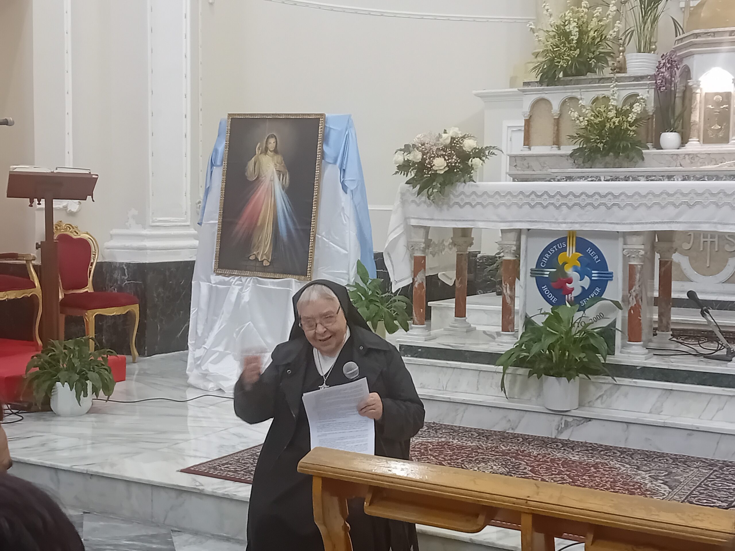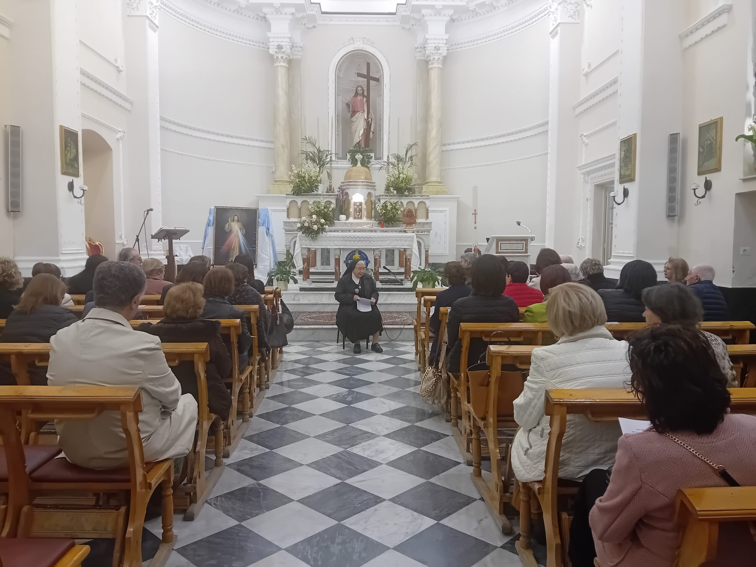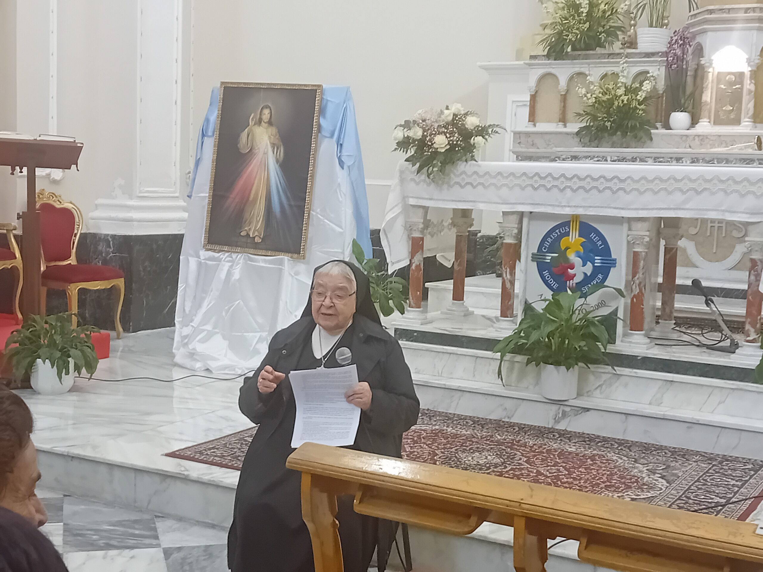 Subito dopo la messa, nel giorno della festa della Divina Misericordia, celebrata da don Calogero Statello, guida spirituale del gruppo da anni in cammino per aderire ufficialmente all’Associazione Laici Amore Misericordioso, suor Rifugio ha tenuto una catechesi ricca di spunti interessanti, soffermandosi sul carisma di madre Speranza e dell’Amore Misericordioso e condividendo con i numerosi presenti alcune esperienze vissute in prima persona quando viveva accanto a madre Speranza.