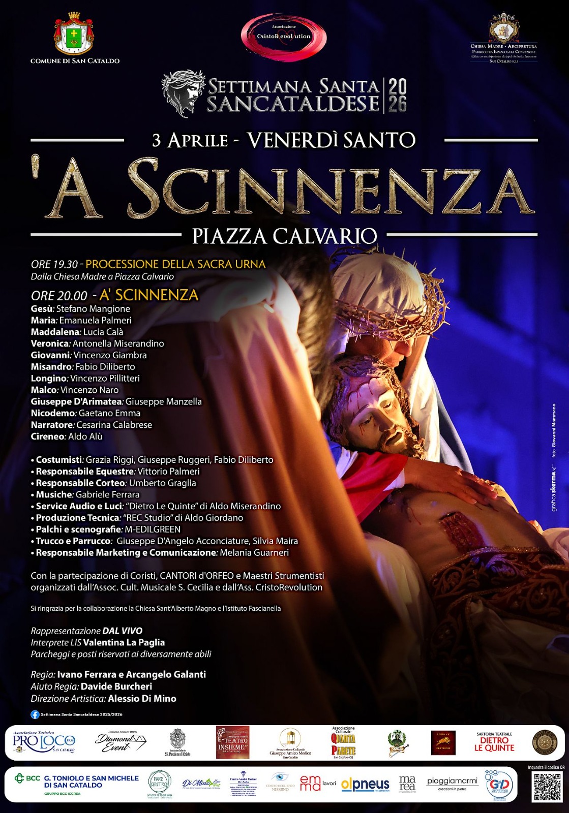 Quest’anno “A Scinnenza”si trasforma in una vera e propria Opera Sacra Totale, sotto la direzione dell’associazione CRISTOREVOLUTION. E’ questa la novità. Superando la staticità delle rappresentazioni tradizionali, l’edizione 2026 diventa una performance dal vivo con accompagnamento orchestrale — composto da oltre 60 elementi — e canto lirico, <<in una fusione tra prosa e musica che punta a valorizzare la rappresentazione del Venerdì Santo non solo come meta di pellegrinaggio, ma anche come destinazione di rilievo artistico internazionale, sottolinea la presidente di CristoRevolution, Veronica Ferrara>>.
